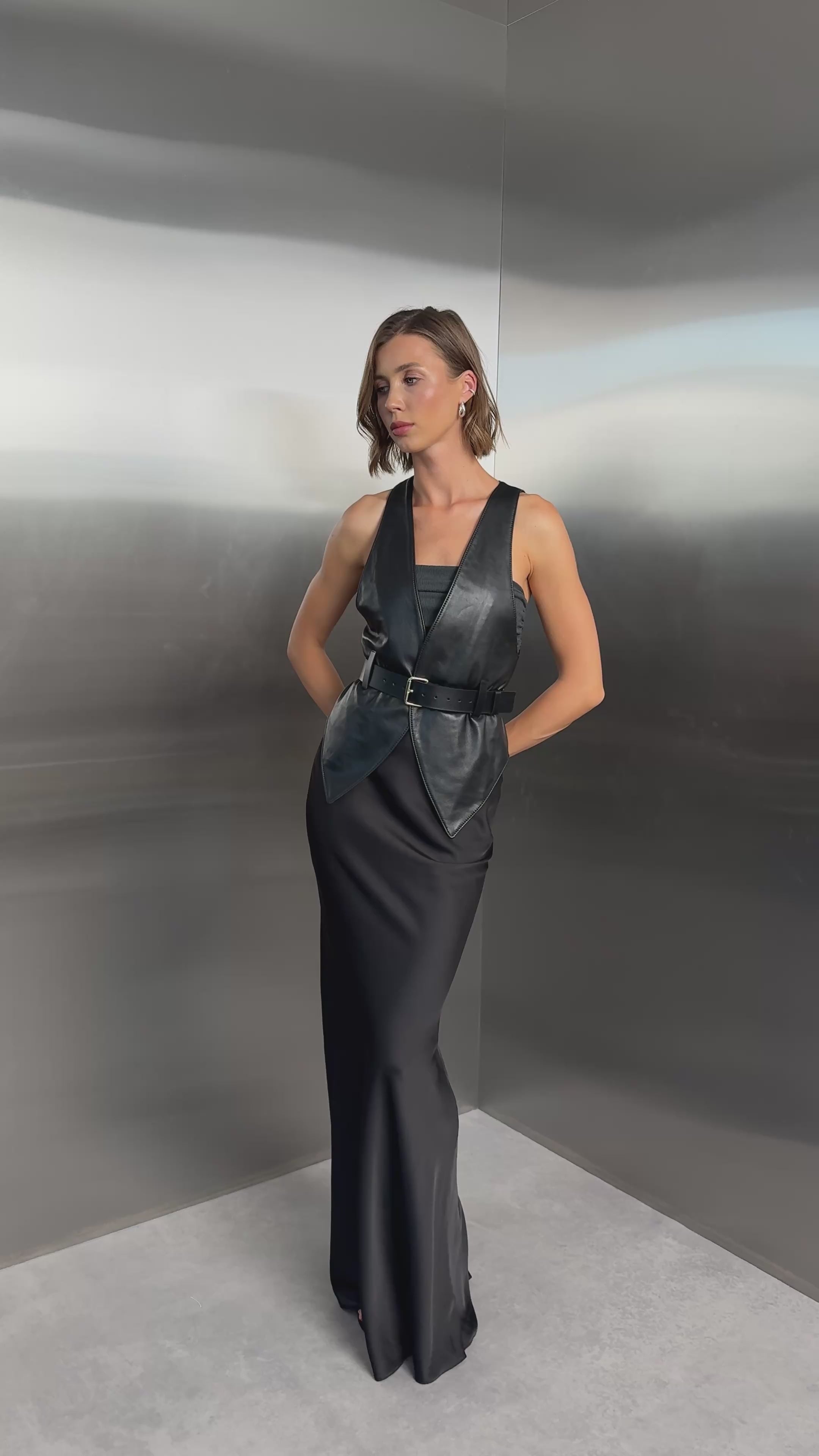 Скульптурний витвір мистецтва. Виготовлений з м'якої шкіри, цей жилет має глибокий виріз горловини, що обрамляє ключиці, та асиметричний поділ, що видовжує силует.