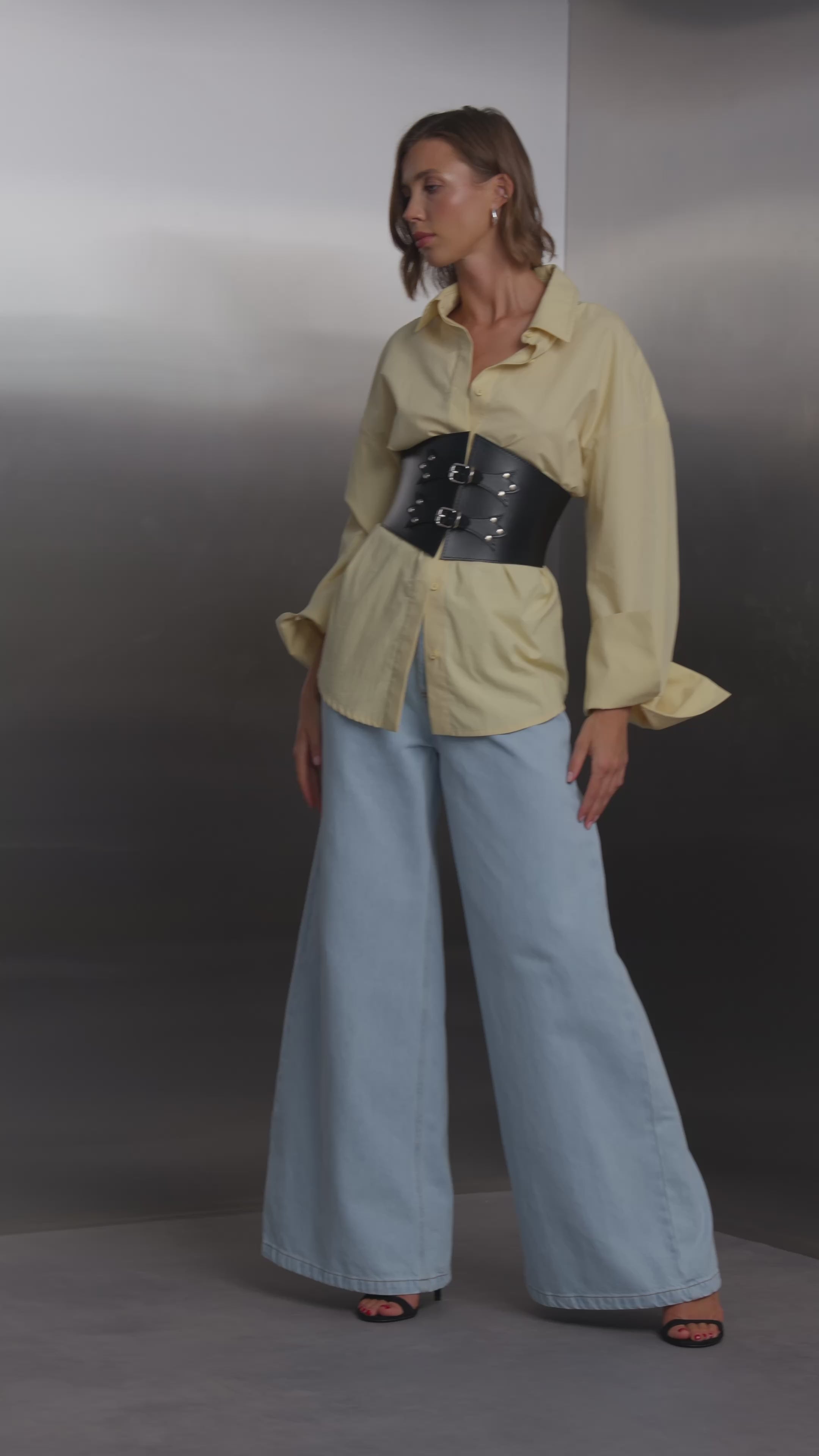 Широкий корсетний пояс із гладкої шкіри з металевими люверсами та пряжками спереду. Акцентна фурнітура кольору золота додає графічності та виразності. Завдяки шнурівці ззаду пояс щільно фіксується по фігурі, підкреслюючи талію. Носіть із сукнями, жакетами або об’ємними сорочками - для балансу силуету.